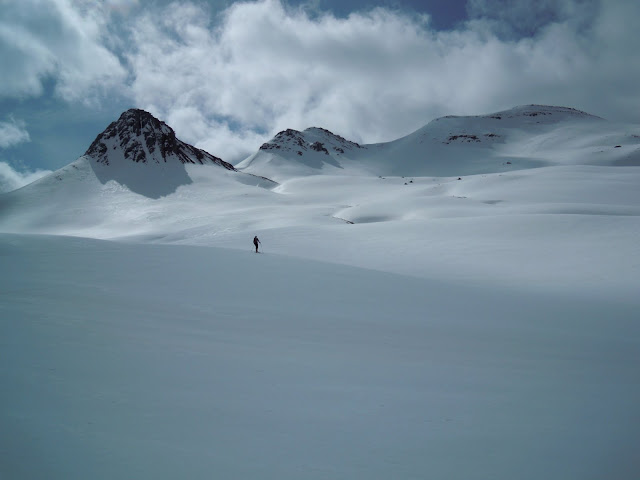 Cada vez hay más nieve. Al fondo a la derecha el Anatera hacia donde Julio se dirige en la soledad del valle.