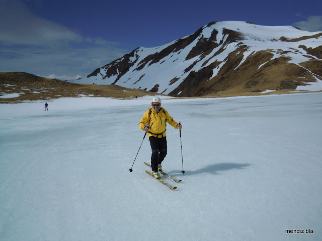 Salimos de Astun con los esquís en la mochila y a los siete minutos nos ponemos los esquís y vamos buscando entre la nieve y la hierba. Después los llevaremos otra vez a cuestas unos diez minutos para acceder al lago de las ranas. Desde aquí vamos hacia el collado del puerto de Jaca y después hacia el collado de Benou o de los Monjes donde dejamos los esquís para subir a la cumbre des Moines. Volvemos al collado y vemos que el tubo-pala está en geniales condiciones para descenderlo, y empezamos una genial bajada por todo el valle de Rebec hasta una cabaña al final del valle, ya a orillas del Bious. Recuperamos fuerzas e iniciamos el ascenso por encima del Bious que es por donde está la nieve para una vez pasadas las laderas que bajan del Lapassa ascender por el valle dejando el Pic de la Gradillere a la izquierda. Enfilamos hacia el collado del pico Malacara que está a la izquierda del de Astun. Del collado a la cima del pico es un paseo de unos diez minutos. Desde la cima un bonito tubo hacia la estación de Astun y ya por sus pistas hasta el coche. En definitiva un genial y agradable día en compañía de buenos amigos.